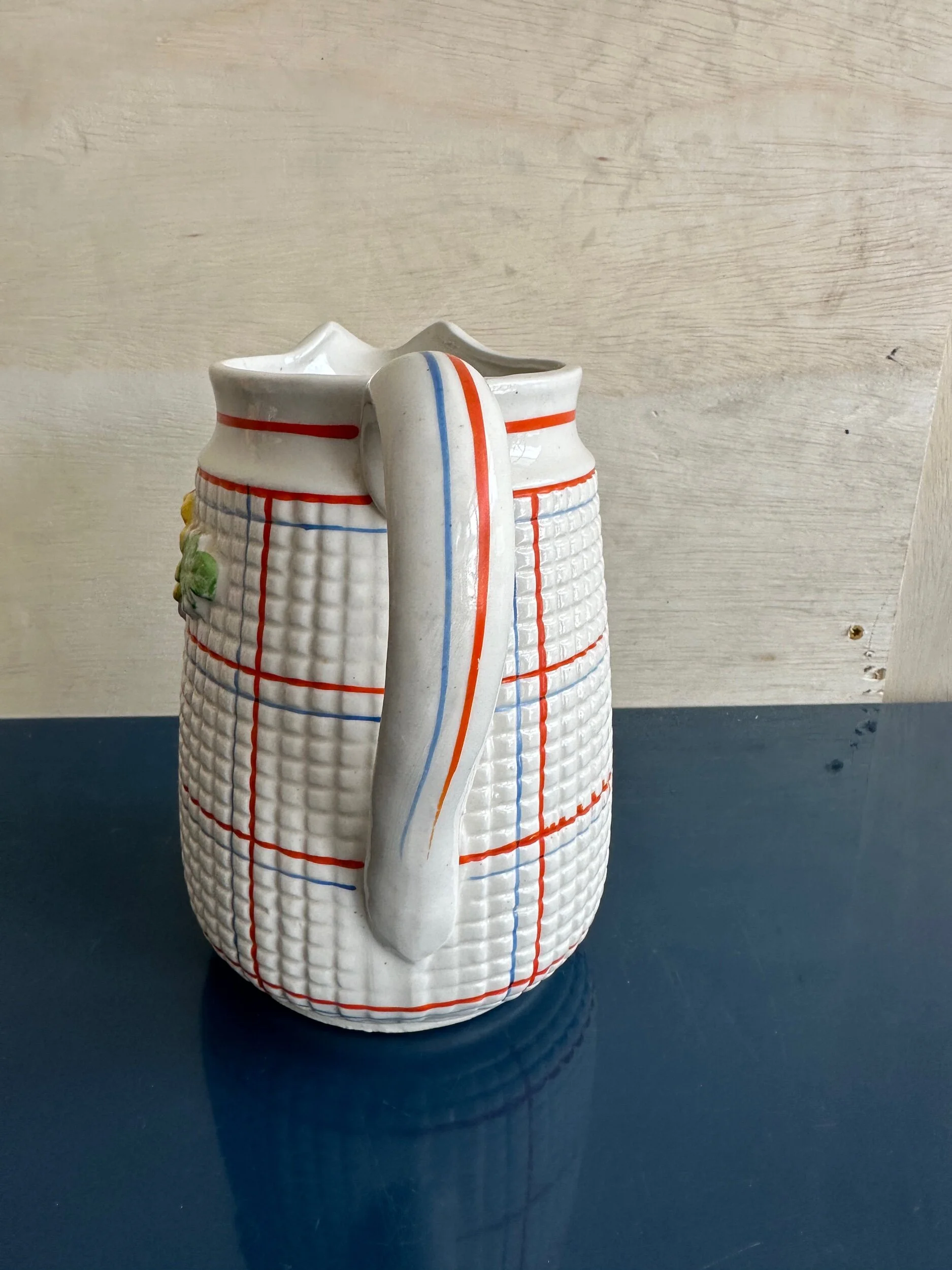 Shop › Vintage Plaid Red & Blue on Cream Pitcher with Yellow Flowers - Great Stripes - Made in Japan - 7.75" tall Image 1 of 4 Image 2 of 4 Image 3 of 4 Image 4 of 4 Vintage Plaid Red & Blue on Cream Pitcher with Yellow Flowers - Great Stripes - Made in Japan - 7.75" tall $52.00 CONDITION: Minor marks of age. Vintage. Being Sold As Is.MAKER: None. Bottom shows “Made in Japan” Add To Cart Added! CONDITION: Minor marks of age. Vintage. Being Sold As Is.MAKER: None. Bottom shows “Made in Japan”