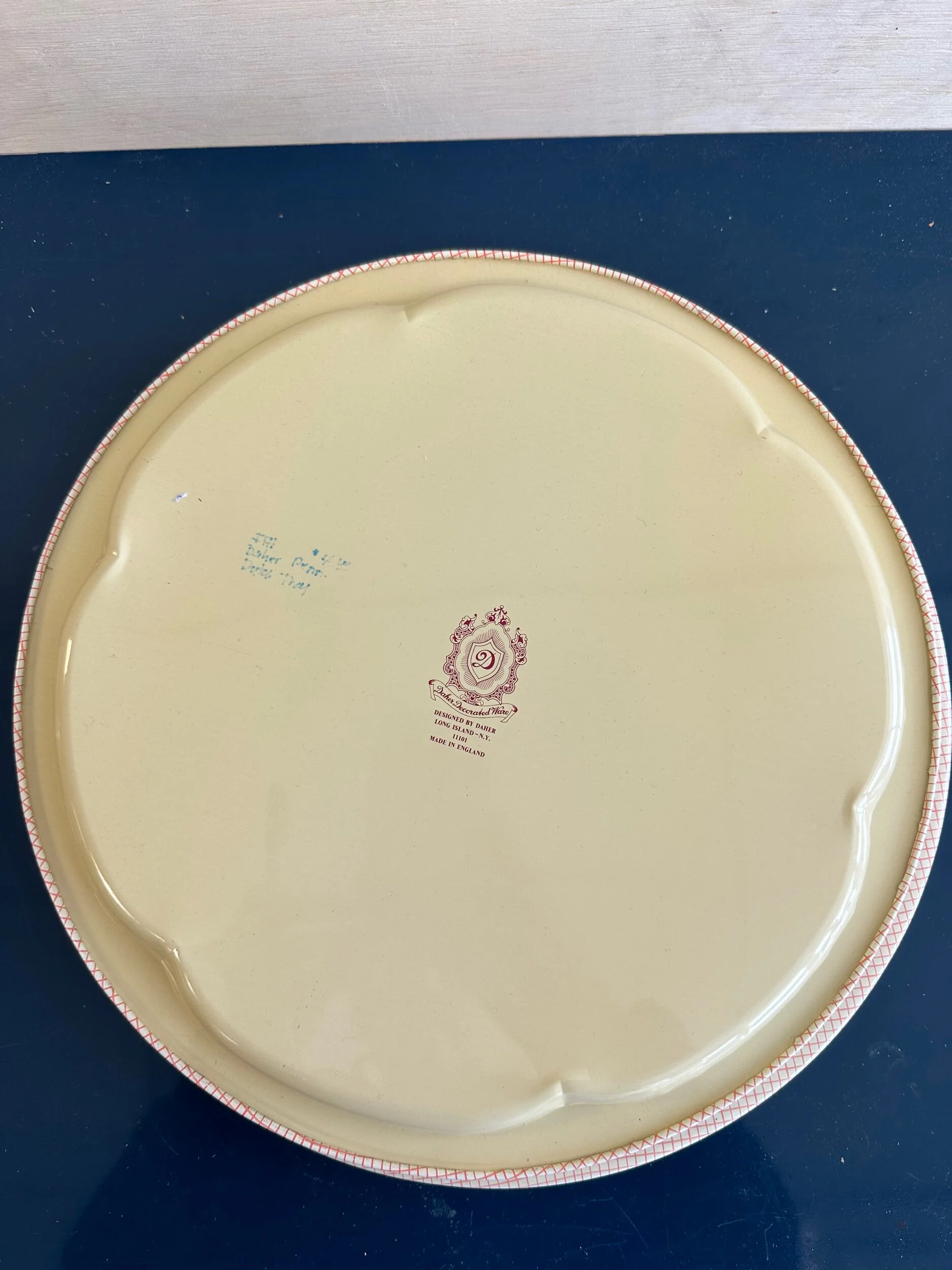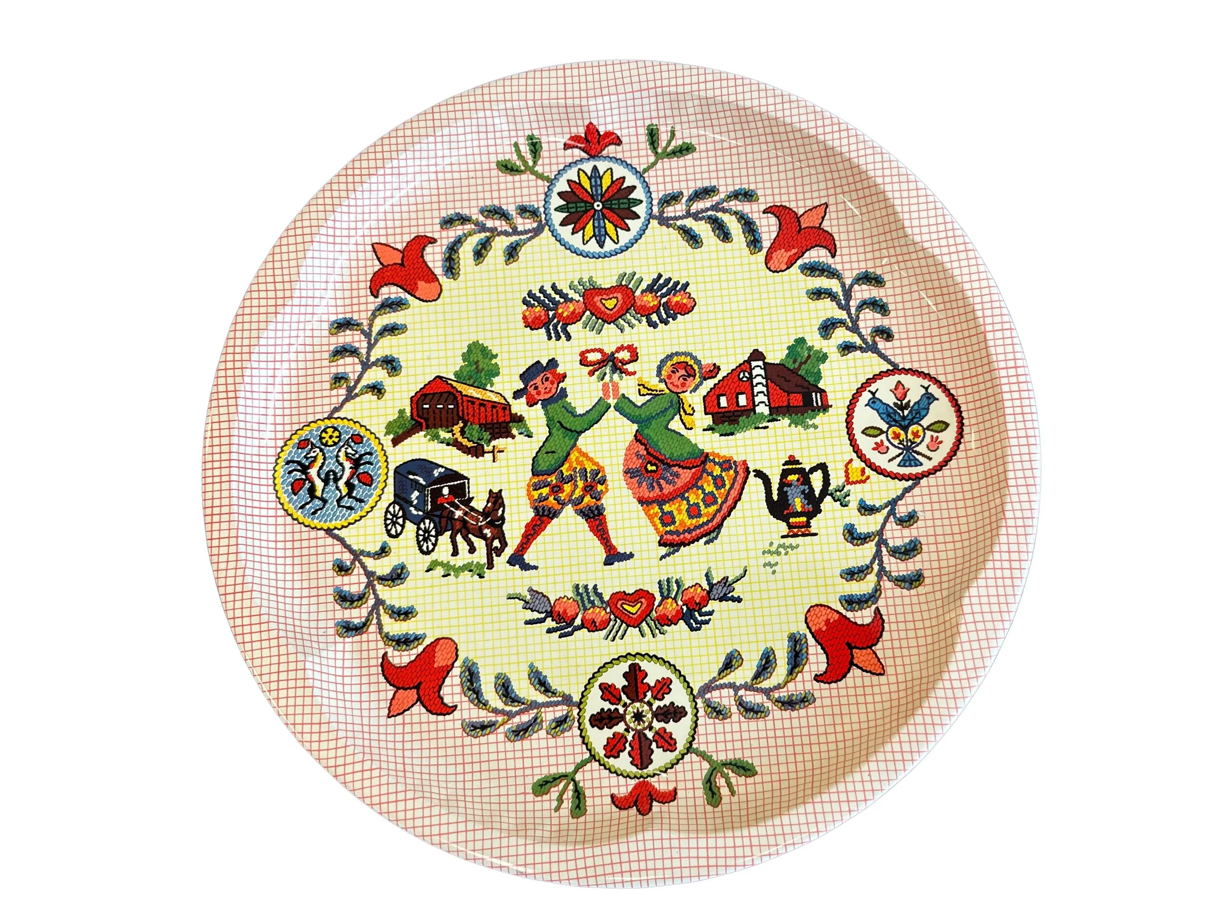 Vintage Set of7 Daher Metal Trays in Pennsylvania Dutch or Folk theme - in a pink or red plaid